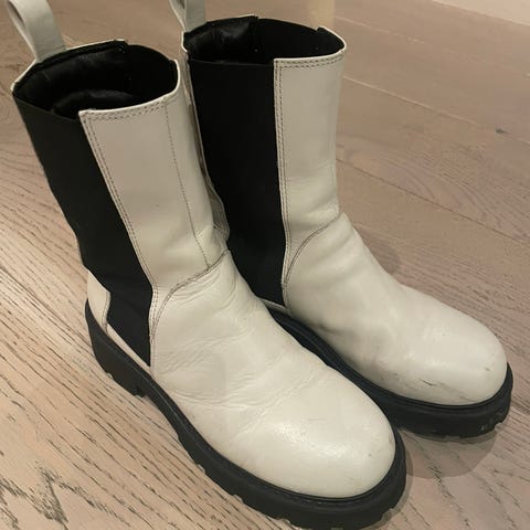 Vagabond støvler i størrelse 38, hvit farge. Støvlene har elastiske paneler på sidene for enkel på- og avkledning. Laget av skinnmateriale med en svart såle. Egnet for hverdagsbruk.