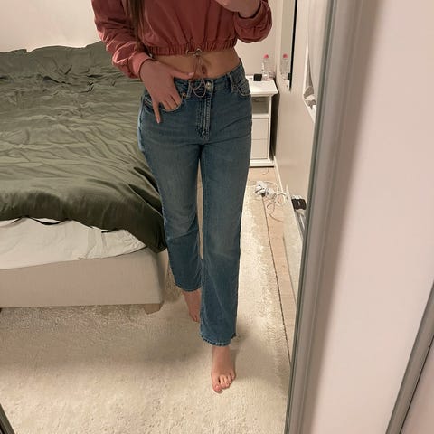 Lite brukte jeans fra Stradivarius str. 38, normal lengde. Jeans med høyt liv og påsydde lommer foran med gylne knapper. Påsydde lommer bak. Overfarvet denim. Stretch. 99 % bomull. Lekker jeans som minner om Jeanerica. Superdeilige på.