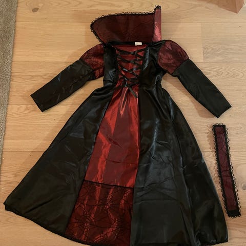 Kostymet har svart kappe med rød krage, vest med fastsydd skorte og slips i front.