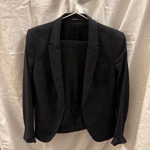 Tiger of Sweden dress (jakke og bukse) til dame, laget av 98% ull og 2% lycra. Den er svart eller koksgrå i farge og er størrelse 34. Dressen har en klassisk passform og er egnet for formelle eller profesjonelle anledninger. Den er utrolig lett og deilig å gå i, veldig pent sydd og høy kvalitet.
