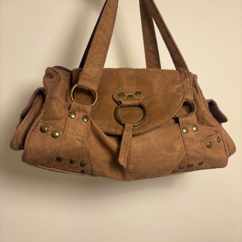 Brun semsket skinnveske fra Italia. Kan brukes som skulderveske og clutch