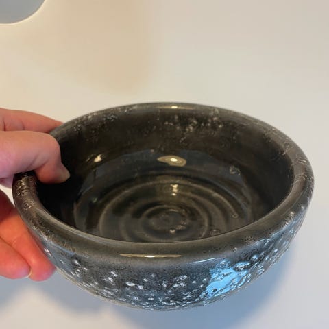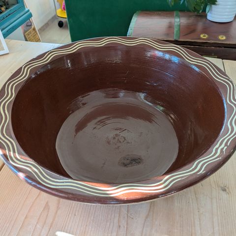 Bolle i keramikk med håndmalt dekorasjon i blått og grønt. Bollen har en diameter på cirka 16 cm. Egnet som dekorativ gjenstand eller til servering av små matvarer.