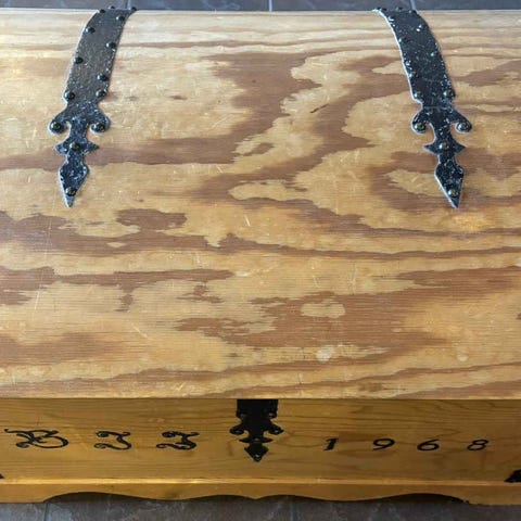 Kiste laget i tre med metallbeslag. Kofferten har en bonderød farge med sorte metallkanter og håndtak. Innsiden er foret med stripete stoff. Kofferten har lås og flere hengsler for lukking. Kan lukkes med 2 beslag i front - lås knepper ikke fast så står litt ut - sikkkert enkelt å fikse for den rette - nøkkel finnes ikke