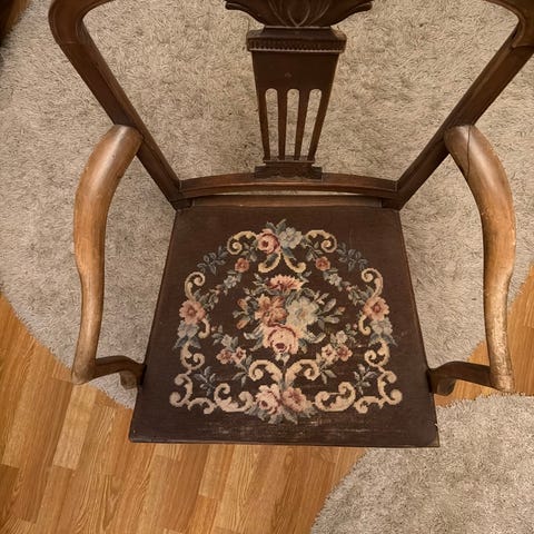 Gammel pen stol med sete trukket i mønstret stoff i grønne og brune toner. Velour - Tre ramme i mørkt tre med buede ben. Setet er polstret og har et dekorativt stoffmønster. Passer til bruk som spise- eller ekstra stol. Høyde 86 setehøyde 45 bredde sete 43 målt foran
