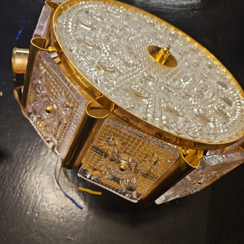 Lampeskjermene er laget av hvitt glass med et vakkert, bølget mønster i hvitt og dekorative detaljer i gull/ravgult. Toppen av skjermene har detaljer i krom og en klar "glasskule" som gir et ekstra elegant preg.