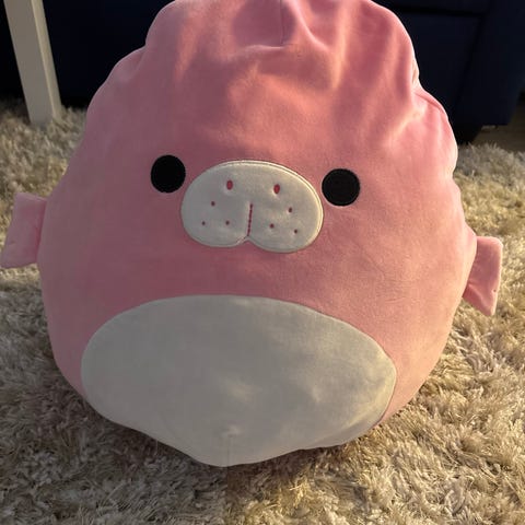 Squishmallows i form av en lilla dinosaur selges. Den er 20 cm høy.