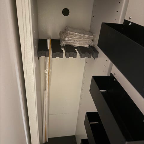 Mangler kroker for å holde hylle oppe da den ikke har vært brukt og kun ligget på bunn i skapet, kan evnt lime på noe lister for å få den opp.