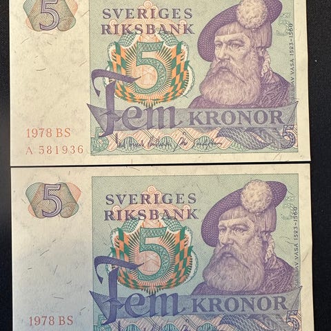 Sveriges Riksbank 5 Kronor sedler fra 1969. To sedler i nummerrekkefølge.