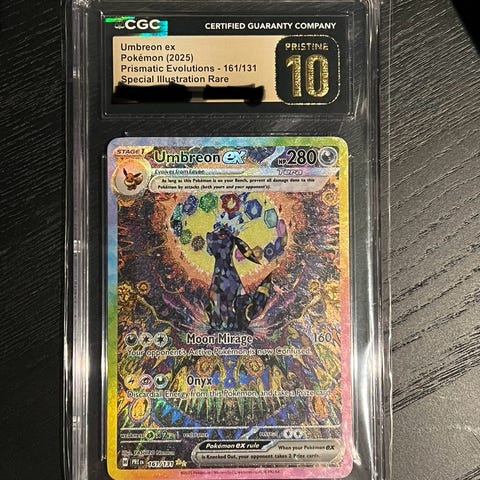 Umbreon VMAX Pokémon kort med holografisk design. Kortet er innkapslet i en beskyttende plastkapsel med vurdering 10 fra CGC. Passer for samlere og entusiaster av Pokémon-kort. Har flere av denne:) kan trade. Last sold er 4300