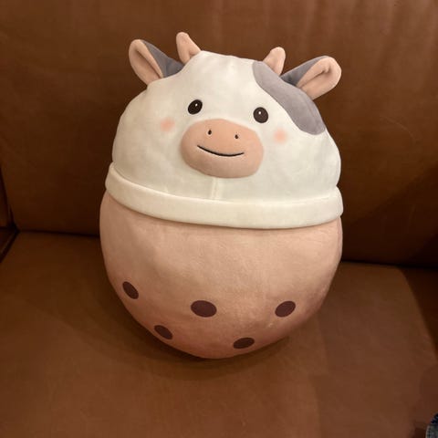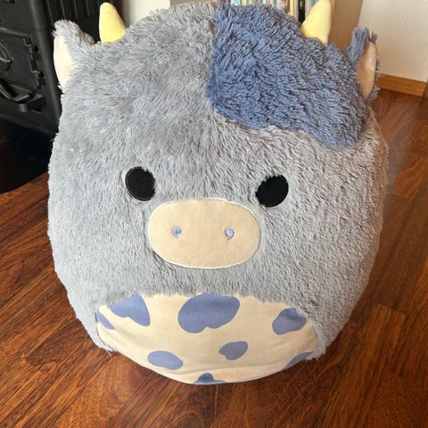Squishmallows rosa og hvit ku med mønster.