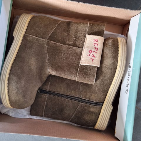 Fortsatt mye såle igjen, og hel og pen i stoffet. Noe bruksmerker i den hvite gummisålen. En lisse trenger utskiftning, selges derfor til en rimelig pris. Se bilde.