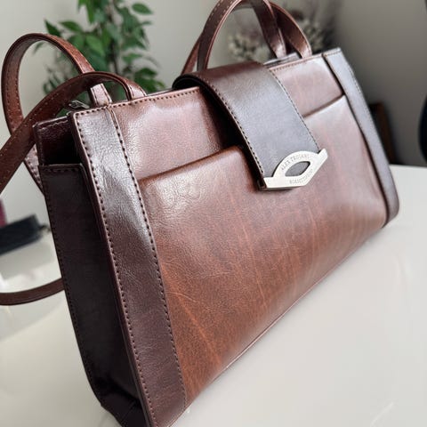 Burgunderfarget clutch med avtagbare skulderstropper. Flere praktiske lommer.