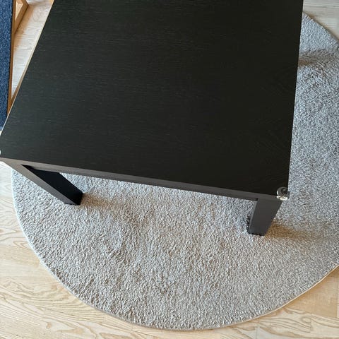 Smalt smekkert salongbord med skinn lomme i den ene enden