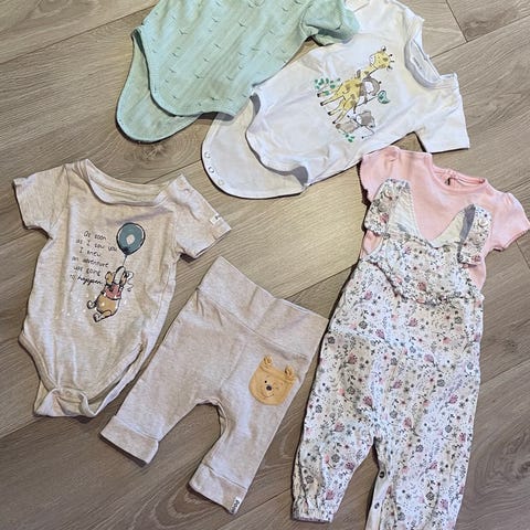 Klespakke til jente i størrelse 62 med flerfarget design. Inneholder ulike plagg som kjoler, bodyer og bukser i forskjellige farger og mønstre. Merker som Polarn, Cubus, refleks og hust and claire.