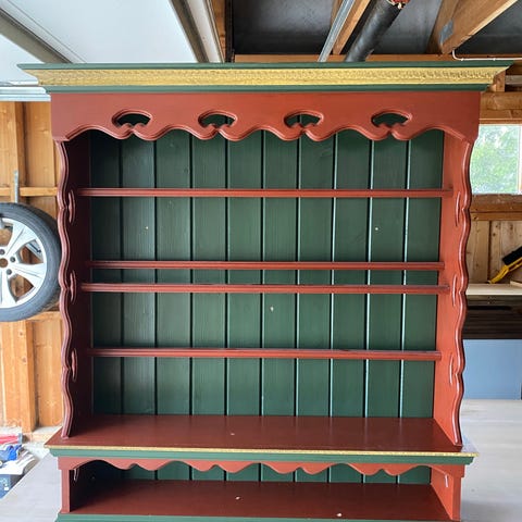 Stor tallerkenhylle malt i rød og grønn.