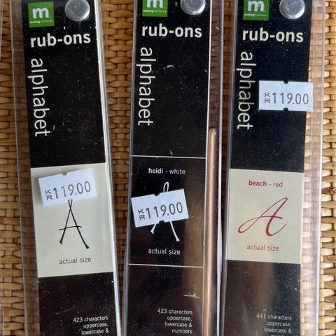 Rub-ons: border, rammer, swirler, fugler, blomster ++ og 2 pk med alfabet/bokstaver