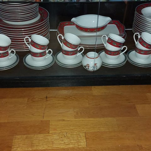 12 stk Tallerkener 21 cm , 6 stk krus og Fat på 36 cm i rød keramikk. Passer til servering og som dekorativt fat. Glasert innside og matt utside. Pent brukt og er uten merker og skader. Merke ukjent. 6 stk eggeglass kan følge med.