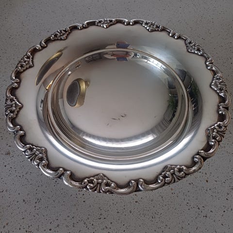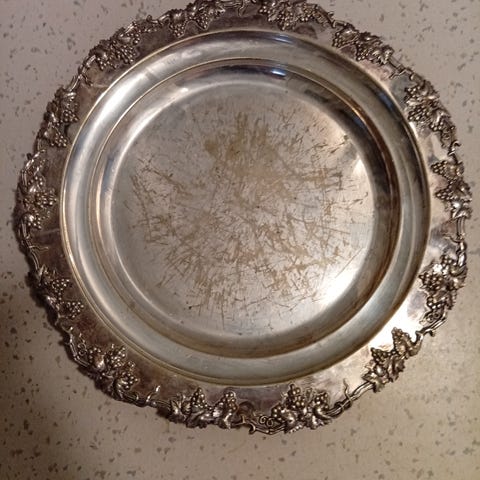 Rundt minnefat i sølvplett med portrett av Roald Amundsen og motiver av tre zeppeliner med teksten "Nordpolen" og et motiv av et isfjell med teksten "Sydpolen".
