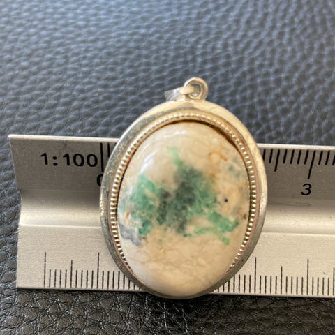 Nydelig anheng pyntet med en vakker smaragd stein i midten.
