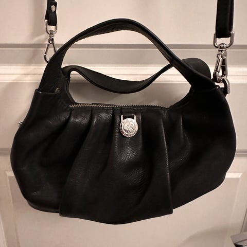 Vesken kan brukes som crossover eller over skulder. Ingen synlig slitasje. Mål: bredde ca. 34 høyde ca. 24 cm, dybde ca. 7 cm. Mykt skinn i farge mørk cognac
