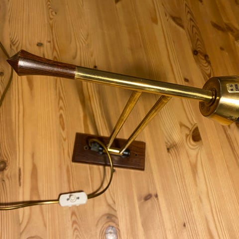 Selger en vegglampe som har vært brukt i en kafe før, skjermene kan byttes. E27 . Noen små bulker på to av skjermene ellers fin. Den henges opp horisontalt. Hentes i Molde sentrum