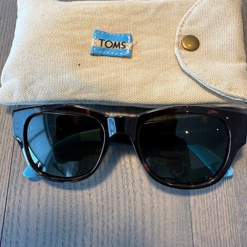 Ray-Ban dame solbriller med blå og svart ramme. Brillene har mørke glass og følger med et etui. Designet for damebruk.