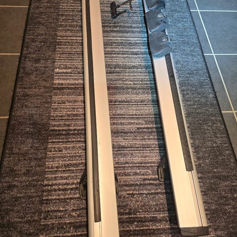 Volvo takstativ med tverrbjelker i aluminium. Passer for montering på taket av bilen for å frakte ekstra last. Leveres som sett med to bjelker. Utstyrt med låsemekanisme for sikker festing. Stått på en Volvo v90 2018 modell, mulig de passer andre modeller.
