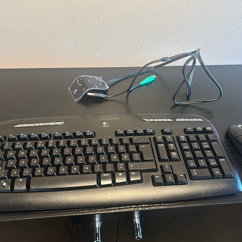 Logitech tilleggsutstyr for datamaskin bestående av tastatur, mus, hodetelefon med mikrofon og musematte. Produktene har kablet tilkobling via USB og er designet for generell bruk med PC.