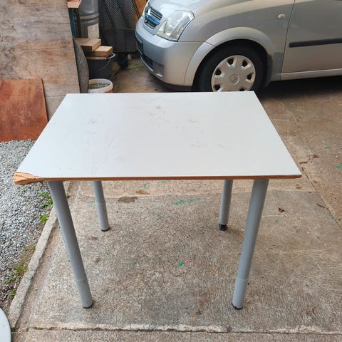Godt brukt pult, en synlig skade til venstre på bordplaten