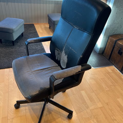 Kontorstol fra IKEA gis bort. Funker som den skal! Har noen flekker på setet som ikke er forsøkt vasket bort. Samt noe slitasje på stoff, men dette er ikke veldig synlig.