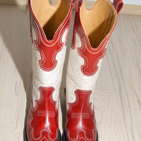 Ganni western boots i størrelse 39. Støvlene har dekorative sømmer og en lav hæl. Egnet som fottøy for ulike anledninger.