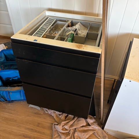 Vi har også mye ekstra mdf-materiale som følger med/om ønskelig. Dette er rester/uåpnete pakker etter bestilling av helt nytt kjøkken.