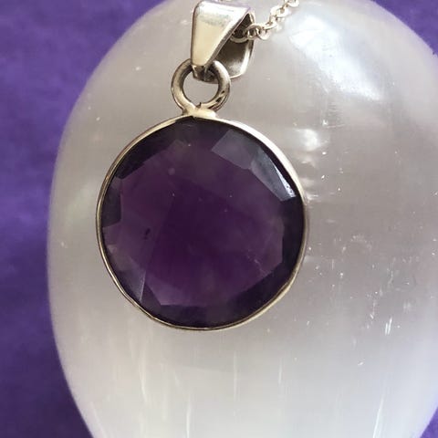 Nydelig kjede med seks rader ametyster selges for 500 kr. I god stand, Den korteste raden måler 48 cm. Ligger pent rundt halsen.