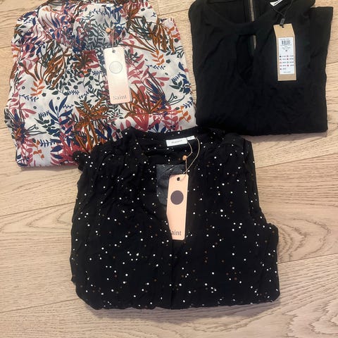Klespakke med topper som er str M. De er i god tilstand noen av toppene er kun prøvd på og ikke brukt. Pris kan diskuteres.