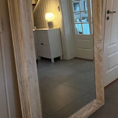 speil, stort speil, stort veggspeil, stort gulvspeil, helfigurspeil, helkroppsspeil, speil til gang, speil til entré, speil til stue, speil til soverom, speil til walk in closet, speil til garderobe, speil til bad (ikke våtrom), dekor speil, pyntespeil, interiørspeil, rammespeil, speil med ramme, stor ramme, bred ramme, ornamentert ramme, dekorert ramme, utskåret ramme, klassisk ramme, fransk speil, fransk stil, paris style, vintage stil, antikk stil, shabby chic, landlig stil, romantisk stil, barokk, rokokko, gustaviansk, herskapelig, klassisk interiør, cottagecore, farmhouse, coastal, hamptons, nordisk, skandinavisk, boho, retro, brukt, pent brukt, interiør, bolig, boligstyling, styling, inspirasjon, speil til fotografering, speil til salong, speil til butikk, speil til soverom, speil til leilighet, speil til hytte, antikkhvit, hvitt speil, kremhvit, patinert, distressed, ramme i tre, trelook, dekor, veggdekor, stor dekor, statement piece, speil 108, speil 77, 108x77, 77x108, rektangulært speil, stort rektangulært speil, kan henges, veggoppheng, gulvstående speil, stående speil, stort speil til gulv