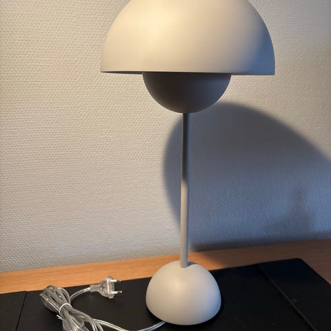 &Tradition Verner Panton Flowerpot bordlampe i VP4 svart. Lampen har en rund base og en kuppelformet skjerm med en karakteristisk design. Egnet som dekorativ og funksjonell belysning i ulike rom.
