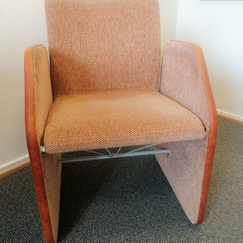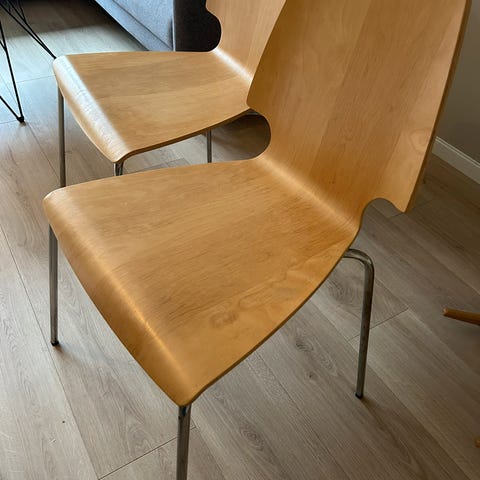 Stolene er i god stand, men har noen flekker på stoffet. De kan dekkes med stoltrekk eller vaskes med et rengjøringsmiddel for tekstiler.