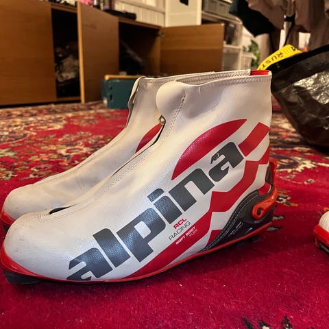 Alpina RCL 2.0 skisko i hvit og rød farge. Skiskoene har lukking med glidelås og snøring.