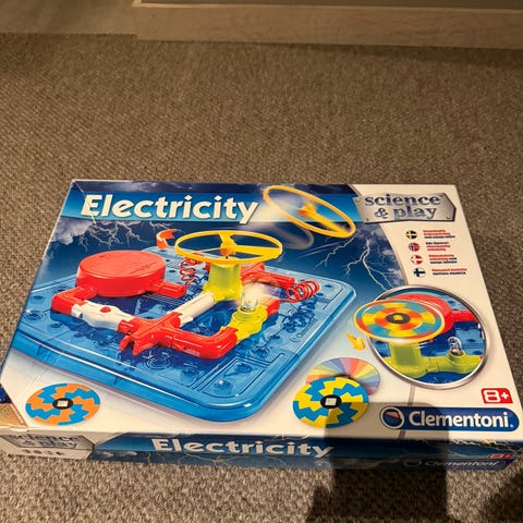 Electro Junior brettspill med tilhørende ledninger og elektroverktøy. Spillet består av flere brett med fargerike illustrasjoner, og er designet for å lære om elektrisitet og kretsløp gjennom praktisk bruk. Egnet for barn.