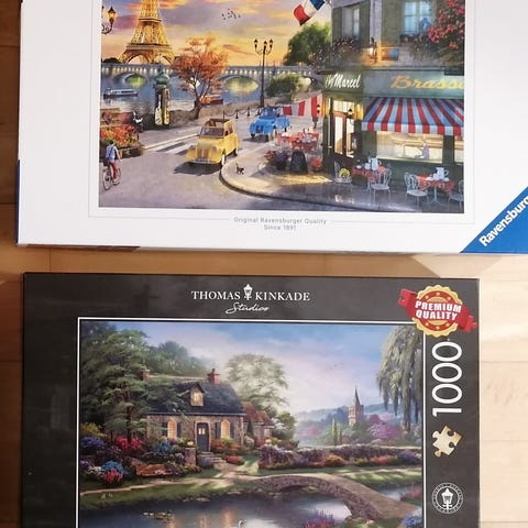 Ravensburger The Greatest Bookshop puslespill med 1000 brikker. Puslespillet viser et detaljert bilde av en bokhandel med sykkel foran. Egnet for voksne og barn som liker puslespill med mange brikker. 250 for begge