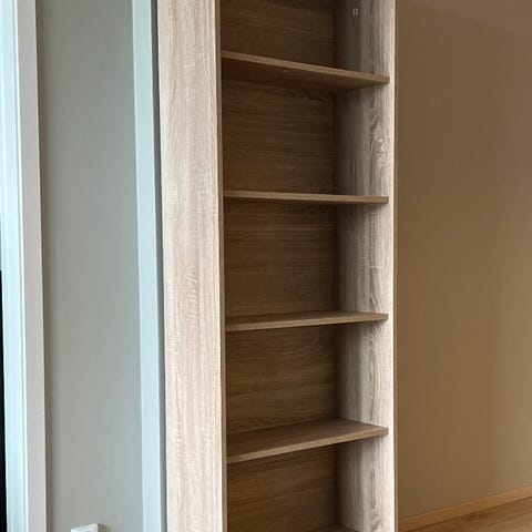 Pen , solid hvit bokhylle .Bredde 67 cm , Høyde 190cm Dybde 30cm . Hyllene måler 55cm •28cm . På den nederste kanten er det noen riper ( se bilde ) Må hentes på Filtvet .