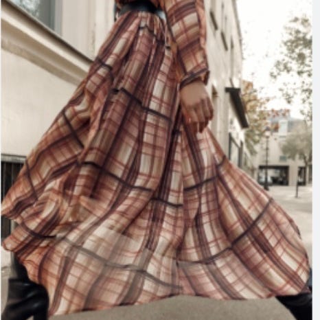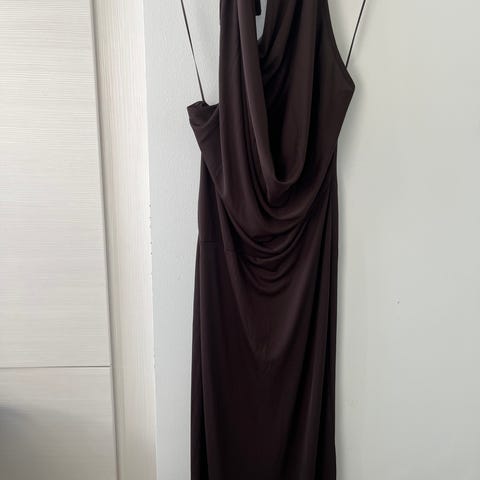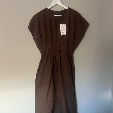 Brun rutete kjole fra Zara selges. Kjolen har firkantet utrigning, dekorative sløyfer på skulderstroppene, knapper foran og lommer i sidene.