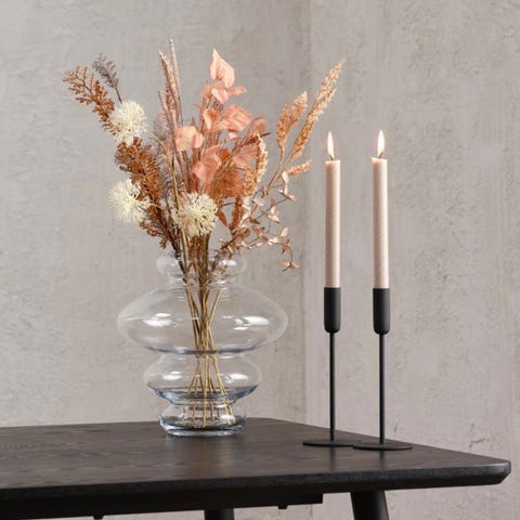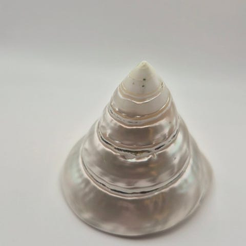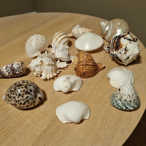 Selger et stort dekor-skjell fylt med mange ulike små skjell, pakket inn i klar plast.