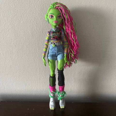 Monster High dukke iført lilla pelsjakke, leopardmønstrede bukser og blå støvler. Dukken har langt hår med rosa og lilla detaljer. Inkluderer tilbehør som flaske, matboks, og en liten lila figur med bok.