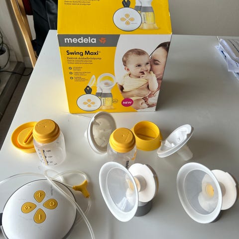 Medela Swing Maxi dobbel elektrisk brystpumpe med tilbehør. Pumpe med to flasker, slanger, og brysttrakt. Designet for effektiv og komfortabel pumping av brystmelk.