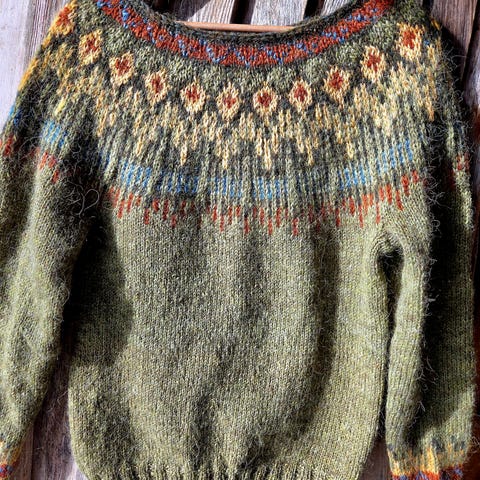 Nydelig genser strikket i norsk pelsull fra Hillesvåg. Design av danske Hanne Rimmen. Passer en størrelse S.