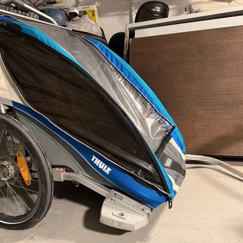 Thule Chariot Cougar dobbelvogn. Perfekt som joggevogn, sykkelvogn og pulk med ski - utstyr for både sommer og vinter. Også perfekt for levering i barnehagen. Komplett sett med store hjul, drag og ski. Passer for 1–2 barn. Trygg og solid konstruksjon. Kun ett «mellomstort» hjul. Se bilder hvor utstyr er vist.
