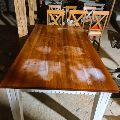 Selger ett stort spisebord på l 250 b 99 h 75.bordet er kjøpt fra Lindas dekor.har 4 stoler som kan sendes med.pris er litt diskutabel ved kjapp handel