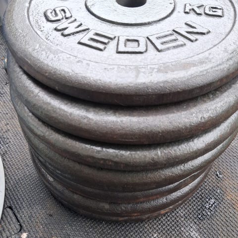 Vektstang og to sett med vekt skiver på 20 og 15 kg selges.