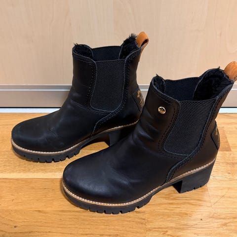 Pent og lite brukte komfortable høghælte støveletter. Liten platåsåle, og prsktisk gummisåle med mønster for vår/vinter/høst. De er foret. Hælhøyde 8 cm, skaftbredde øverst 18,5 + strik-kile. Skafthøyde 30 cm. Selges bare for de er blitt for høyhælte for meg. Cognac-farget/mellombrun.